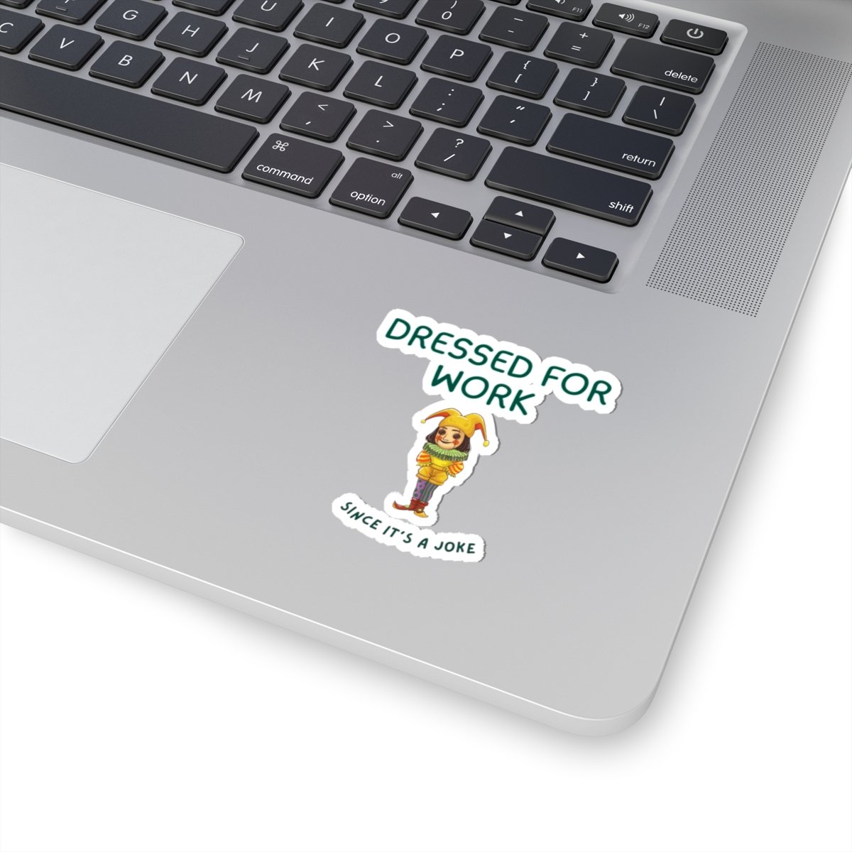 A playful kiss-cut sticker that brings a wink of humor to everyday spaces. The design shows a colorful jester-like character beneath the phrase “DRESSED FOR WORK” with a smaller caption reading “since it’s a joke.” Bright, glossy printing makes the colors pop on laptops, journals, water bottles, or windows, while the kiss-cut outline gives a clean, hand-placed look. It’s meant for someone who enjoys lighthearted office satire and wants a small, cheerful reminder not to take things too seriously.