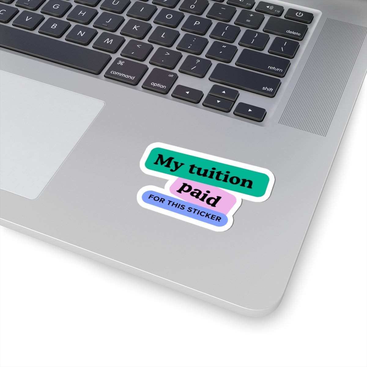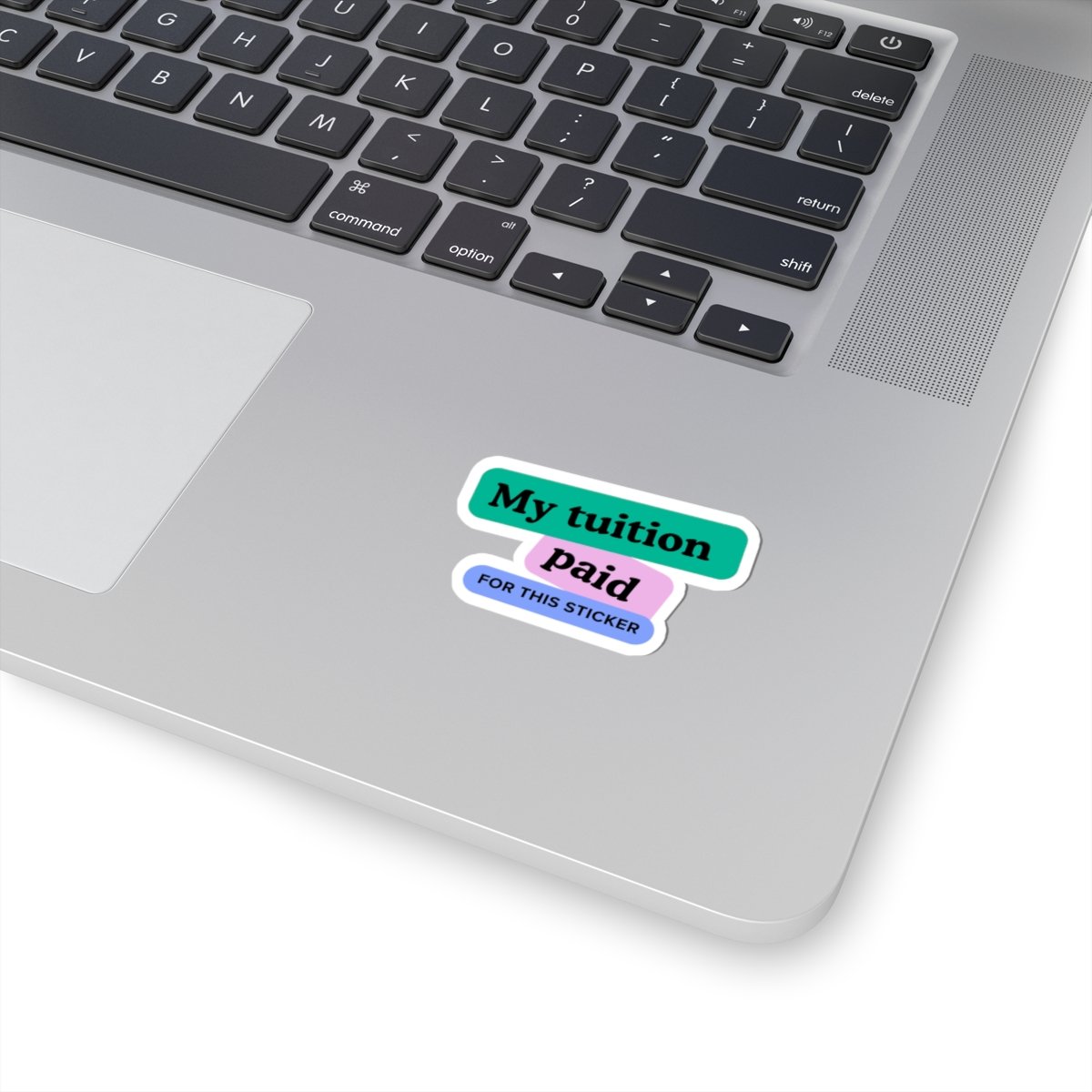 Bright, cheeky kiss-cut stickers that speak student truth. Three stacked pill shapes read “My tuition paid” with a small “for this sticker” tag beneath — bold teal, soft lavender and sky blue with crisp black type. The glossy vinyl finish gives each sticker a lively sheen and punchy color while the permanent adhesive keeps it anchored to laptops, journals, water-bottle sleeves, phone cases and more. Lightweight, age-restricted for adult buyers, and offered in white or transparent backgrounds and four sizes, these stickers add a little humor and personality to study spaces, commuter gear, or any surface that needs a confident, witty accent.