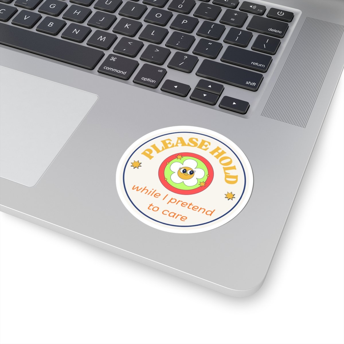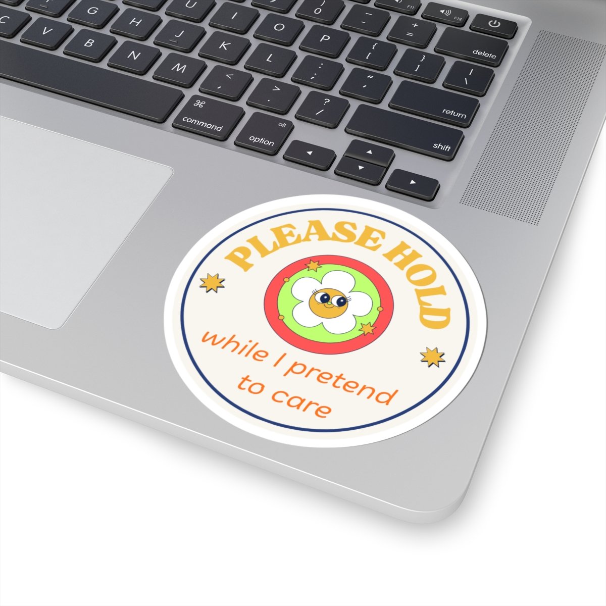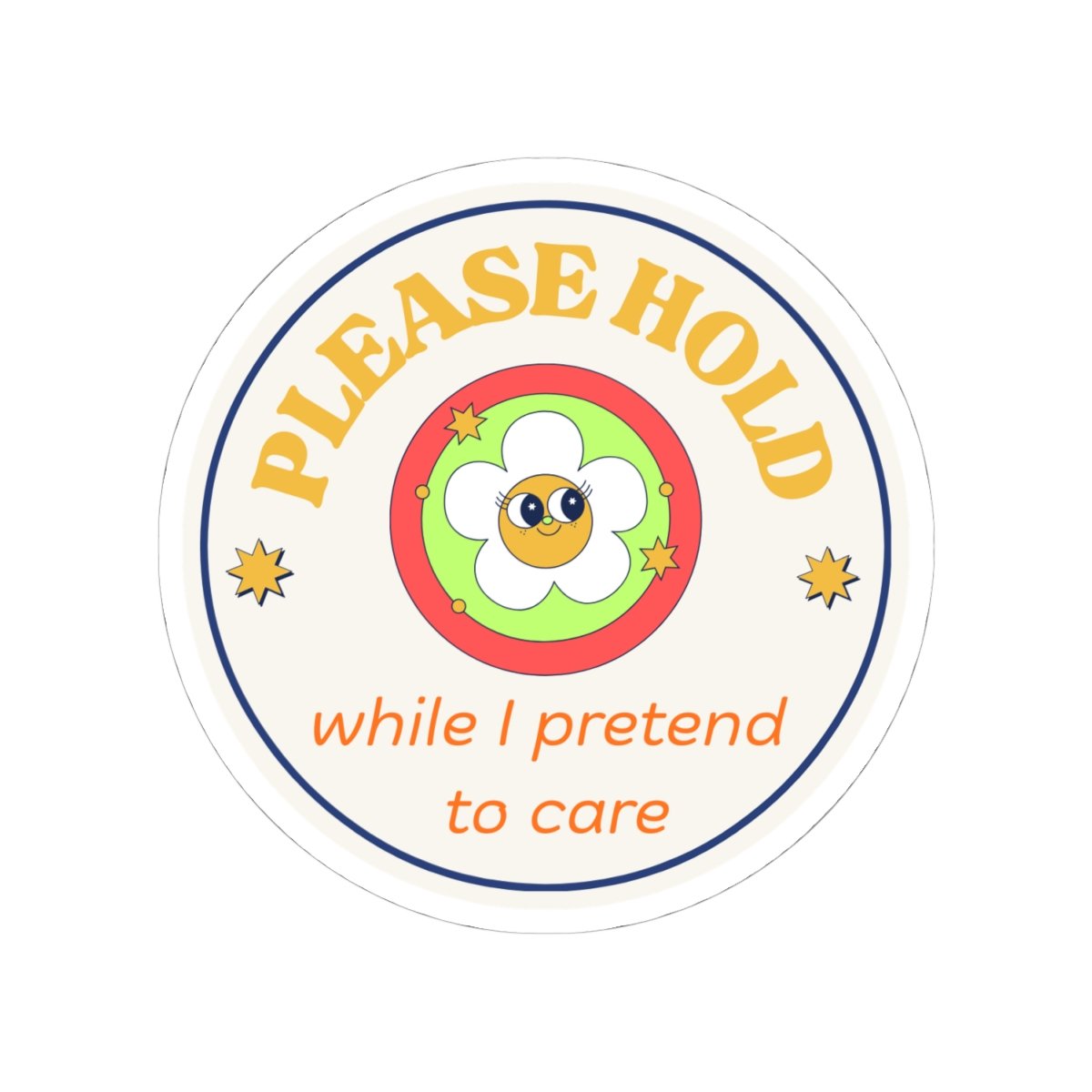A cheeky, retro-inspired sticker that speaks to the quietly sarcastic soul. Warm cream, sunny orange, and soft green form a playful emblem around a smiling flower — the words “PLEASE HOLD” curve above while “while I pretend to care” sits below in a casual, friendly script. It’s small but bold: a tiny stage for deadpan humor that brightens laptops, journals, water bottles, or planner covers. The glossy finish makes colors pop and gives a smooth, scratch-resistant surface, so the joke keeps looking sharp even after daily use. Pop one on your gear to signal low-key boundaries, share a knowing laugh with friends, or tuck it into a care package to send a wink of sardonic affection.